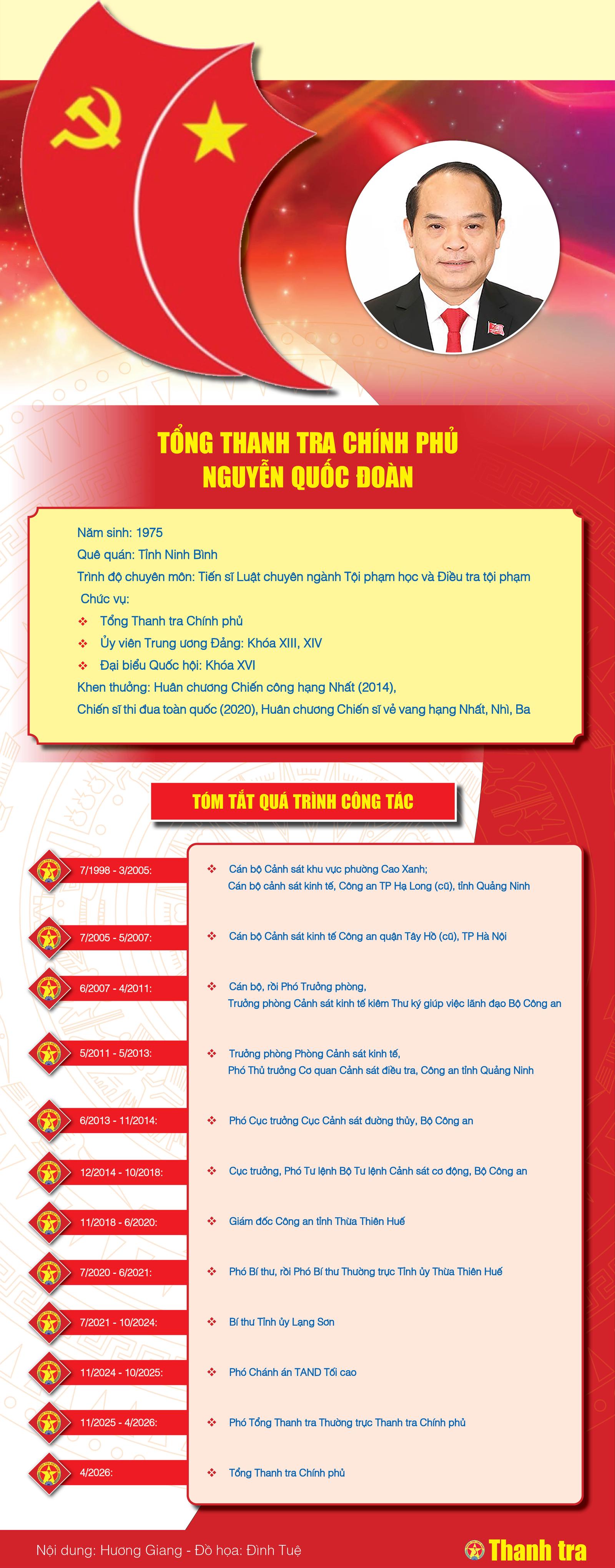 Tân Tổng Thanh tra Chính phủ Nguyễn Quốc Đoàn là cán bộ được đào tạo bài bản. Ông từng kinh qua nhiều chức vụ khác nhau ở Trung ương và địa phương như Giám đốc Công an, rồi Phó Bí thư Tỉnh ủy Thừa Thiên Huế (nay là TP Huế); Bí thư Tỉnh ủy Lạng Sơn; Phó Chánh án TAND Tối cao; Phó Tổng Thanh tra Thường trực.