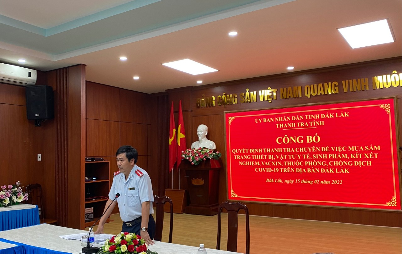 Công bố quyết định thanh tra tra chuyên đề việc mua sắm trang thiết bị, vật tư y tế, sinh phẩm, Kít xét nghiệm, vacxin và thuốc phòng, chống dịch COVID-19 trên địa bàn tỉnh Đắk Lắk.