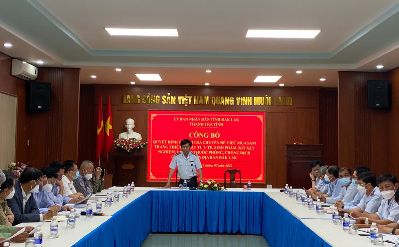 Sáng ngày 15/02/2022, Thanh tra tỉnh Đắk Lắk tiến hành công bố quyết định thanh tra việc mua sắm trang thiết bị, vật tư y tế, sinh phẩm, Kít xét nghiệm, vacxin và thuốc phòng, chống dịch COVID-19 trên địa bàn tỉnh Đắk Lắk.