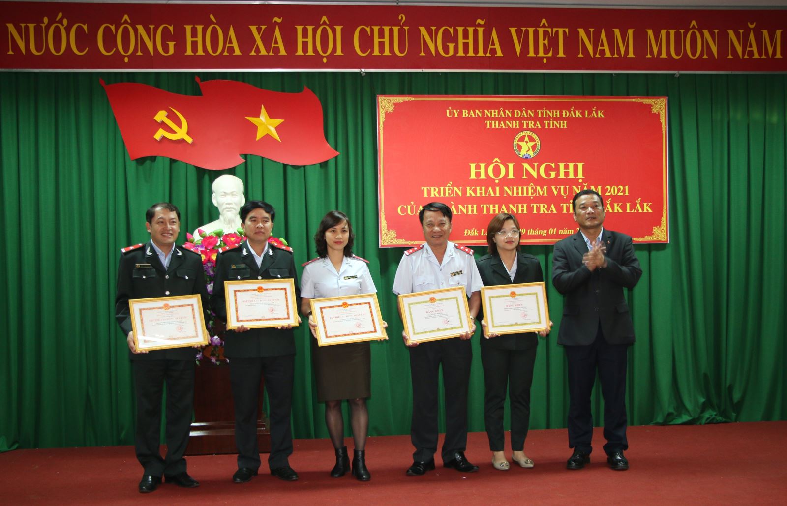Đồng chí Y Giang Gry Niê Knơng trao tặng Bằng khen cho 01 tập thể và 02 cá nhân; tặng Danh hiệu “Tập thể Lao động xuất sắc” cho 03 tập thể thuộc Thanh tra tỉnh Đắk Lắk